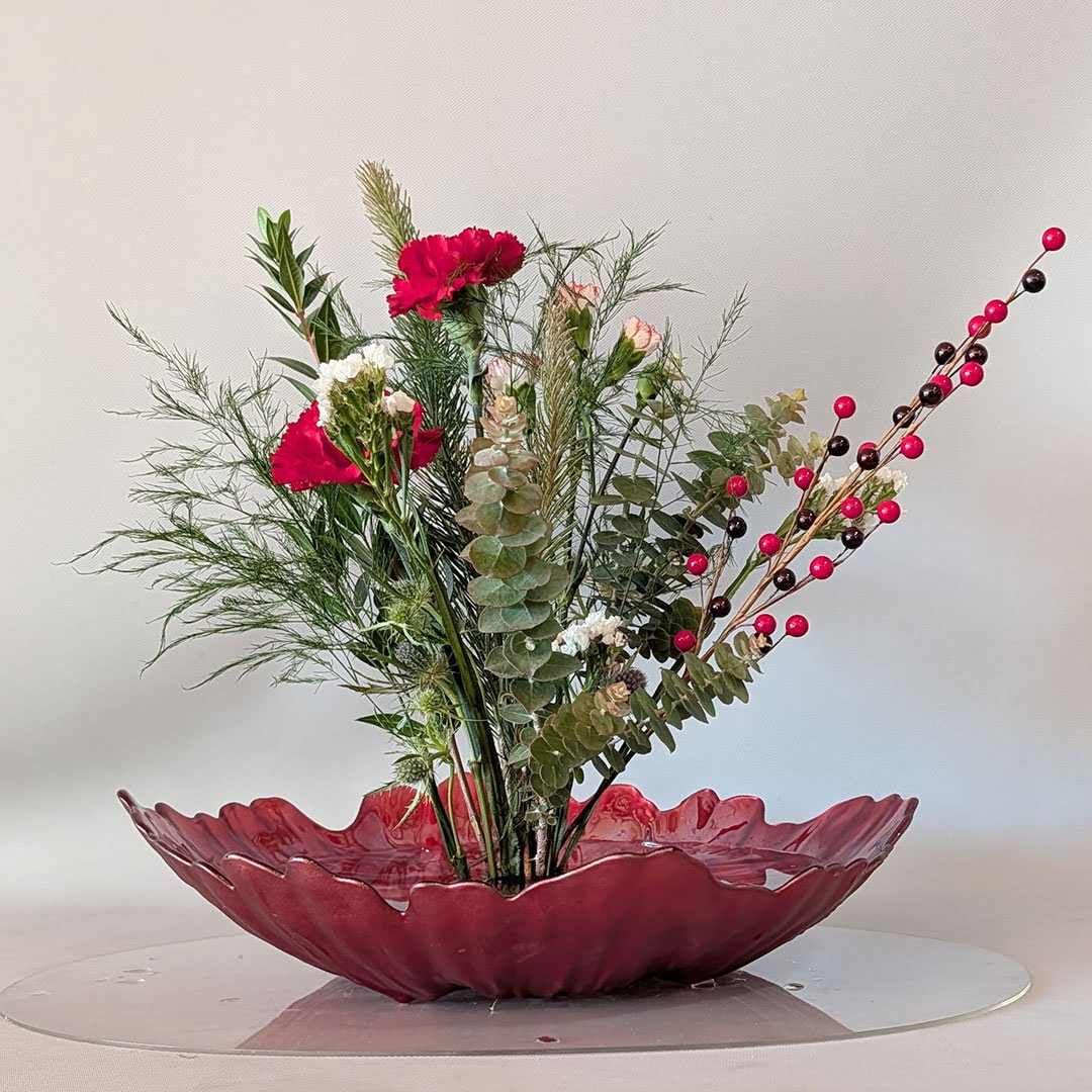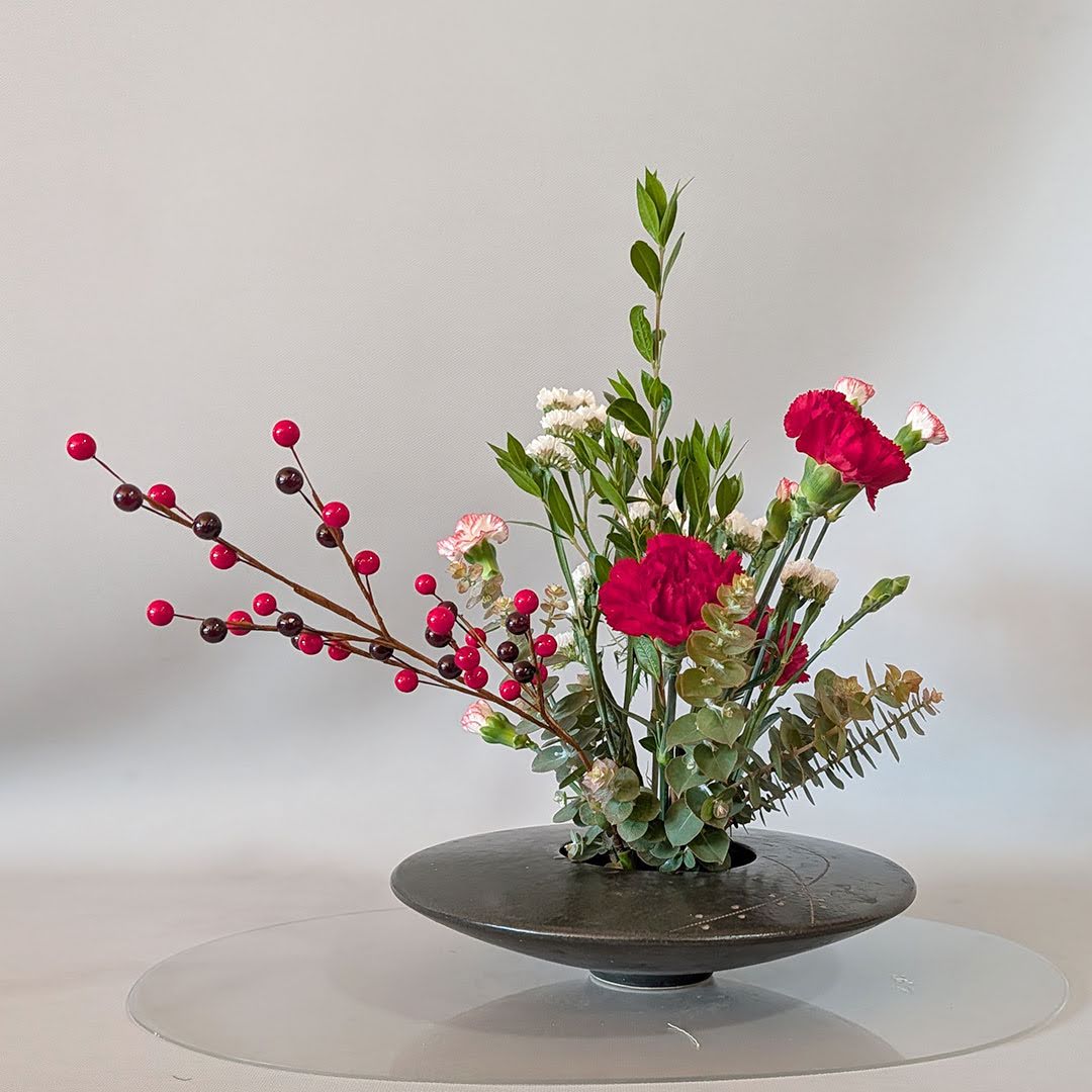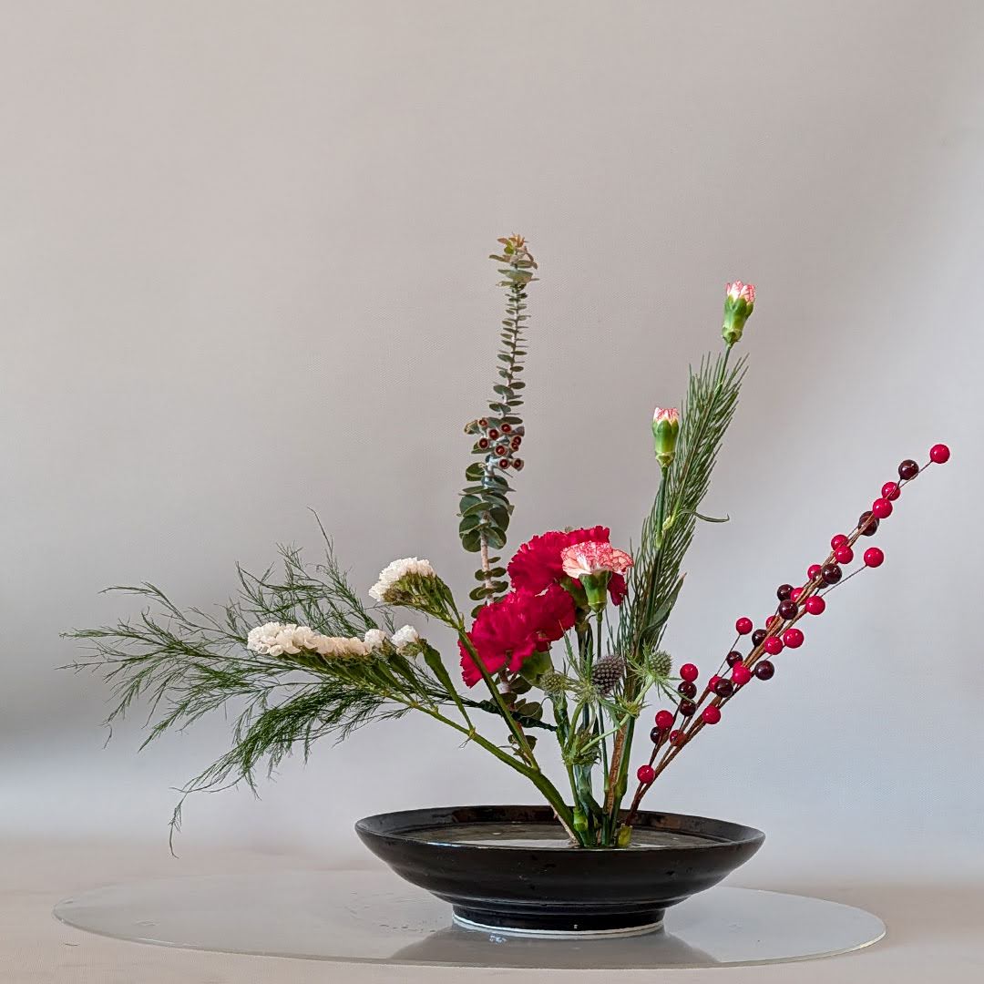 She demonstrated a holiday Jiyuka arrangement, thoughtfully illustrating these considerations and offering guidance on how freedom and structure coexist within freestyle ikebana.