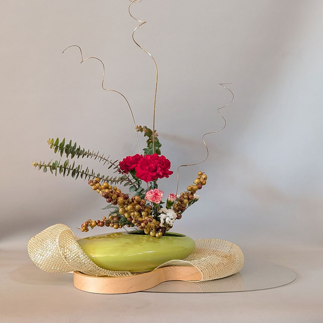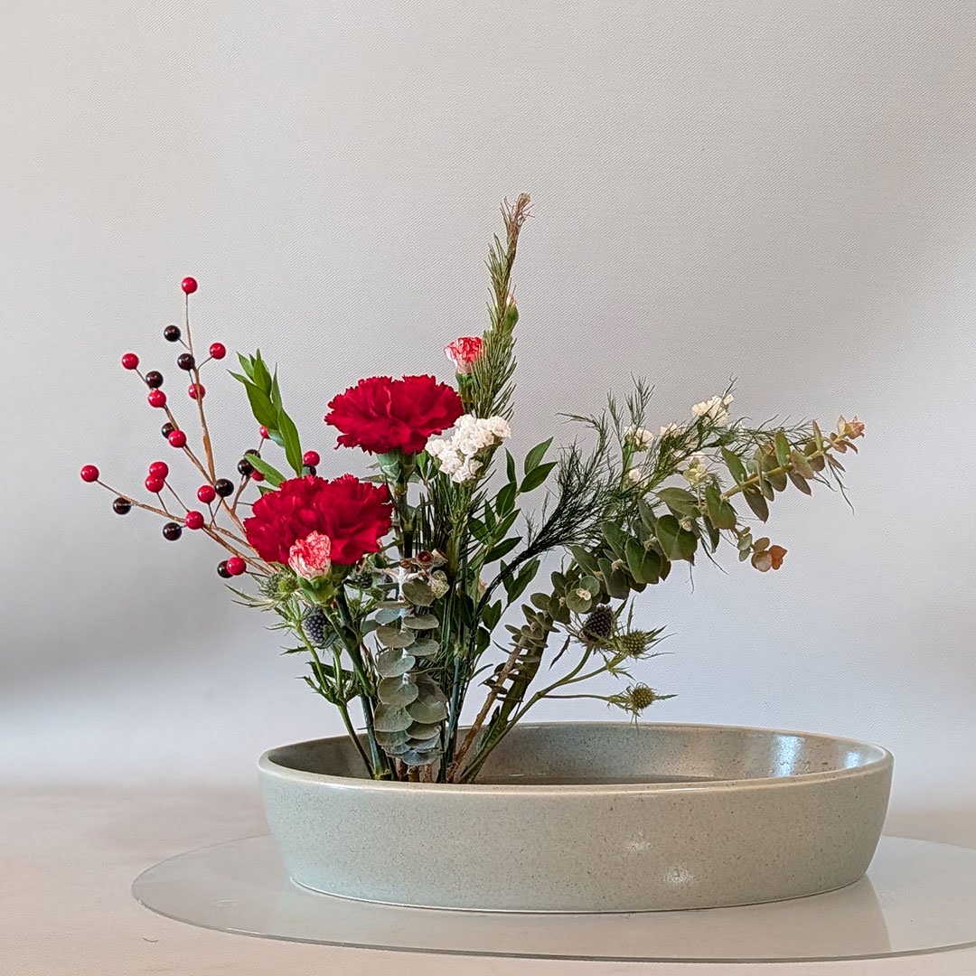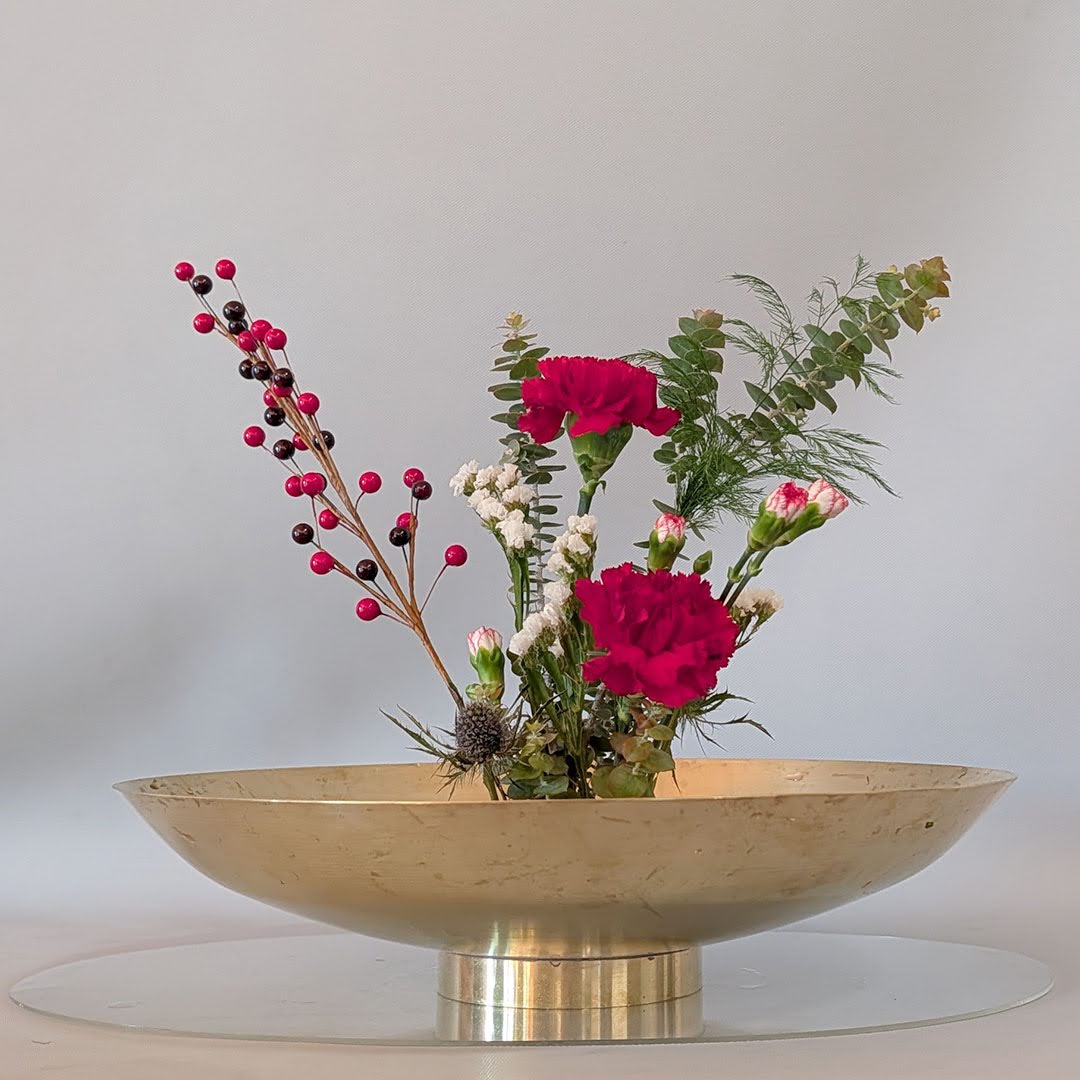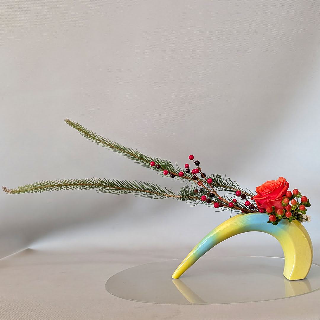 She demonstrated a holiday Jiyuka arrangement, thoughtfully illustrating these considerations and offering guidance on how freedom and structure coexist within freestyle ikebana.