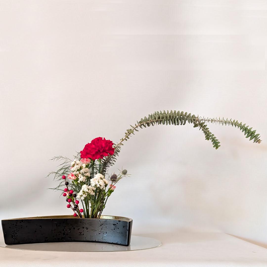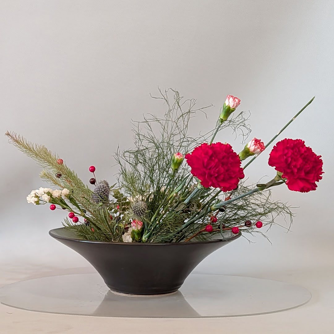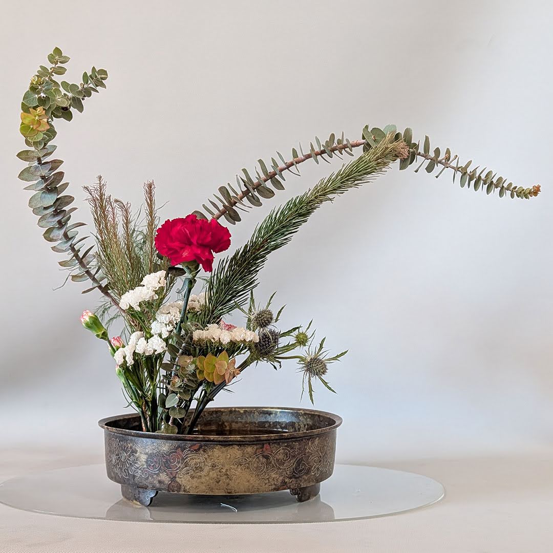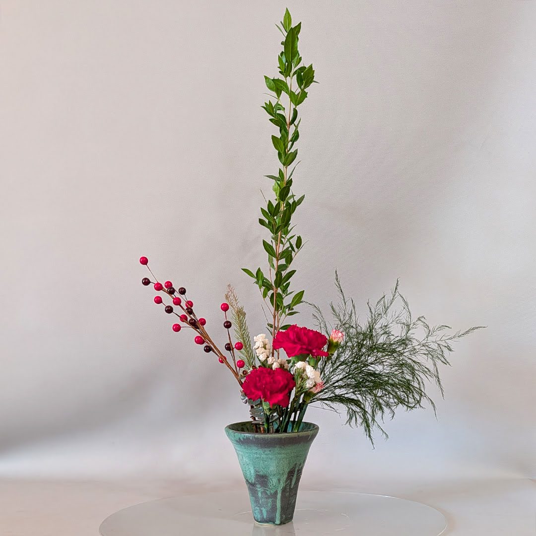 Yuki Sensei then introduced the group to Jiyuka, a freestyle, all-around arrangement well suited for holiday expression. While Jiyuka allows greater freedom than traditional Shoka, Yuki Sensei emphasized that important design principles still apply. One key concept she highlighted was asymmetry—using variation in height, form, and plant material to achieve a sense of balance within an intentionally asymmetrical composition.