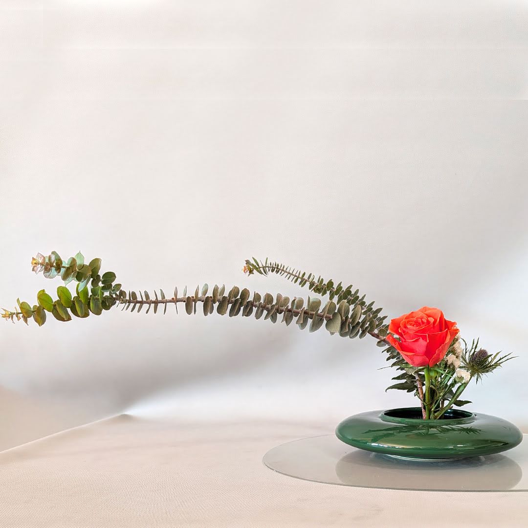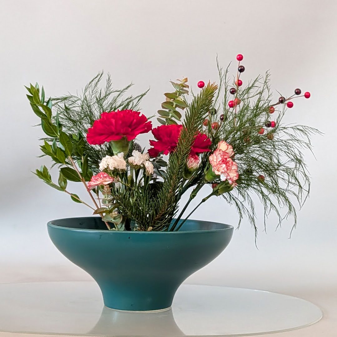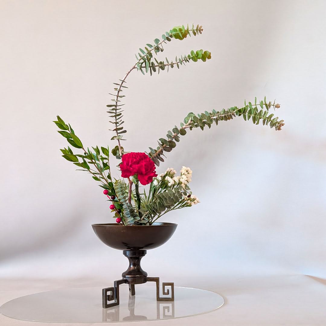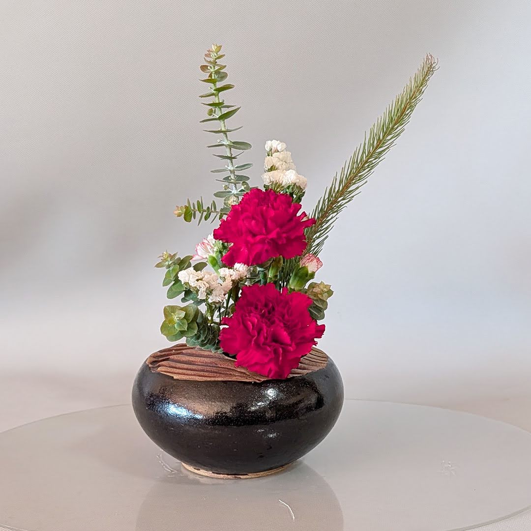 Yuki Sensei then introduced the group to Jiyuka, a freestyle, all-around arrangement well suited for holiday expression. While Jiyuka allows greater freedom than traditional Shoka, Yuki Sensei emphasized that important design principles still apply. One key concept she highlighted was asymmetry—using variation in height, form, and plant material to achieve a sense of balance within an intentionally asymmetrical composition.