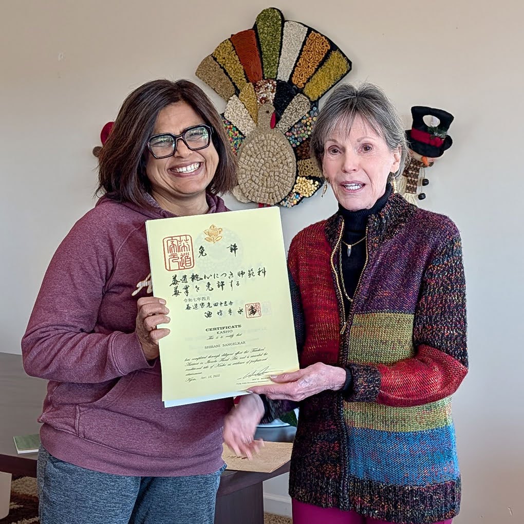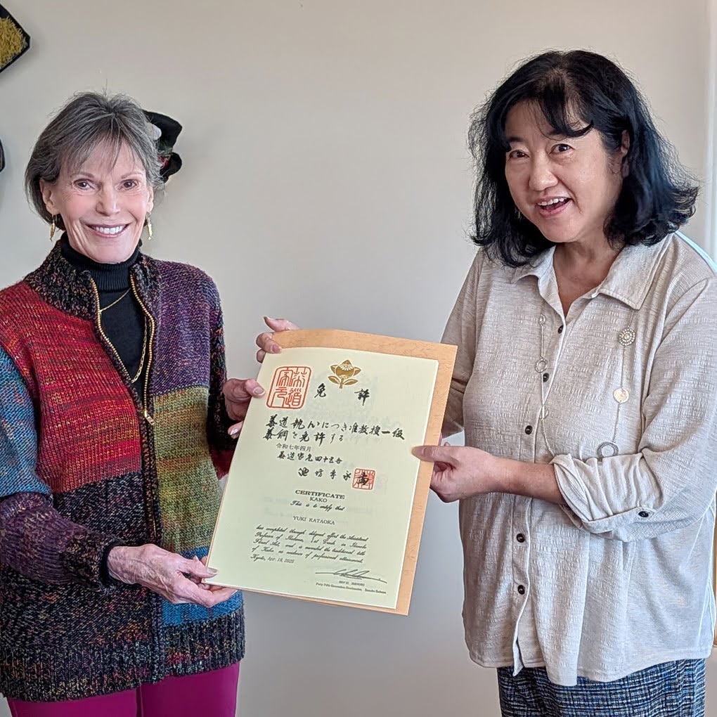 In this festive workshop, Yuki Sensei led participants through a joyful all around holiday arrangement lesson, perfectly timed for the Christmas season. Before the lesson began, Linnéa Sensei presented certificates to students who had recently earned new ranks. Shibani Sangelkar received her Kasho (5th) certificate, and Yuki Kataoka was awarded her Kako (11th) certificate.